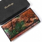 Женский кошелек из натуральной кожи. Закрывается на клапан с кнопкой. Под клапаном, на лицевой стен…