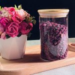 Набор банок их стекла с бамбуковыми крышками на металлической подставке.