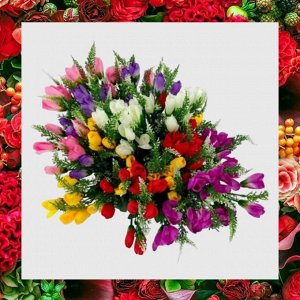 Букет роз с декоративной пластмассовой и текстильной зеленью.