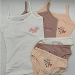 Комплект для девочки состоит из майки на широких бретельках и трусиков. Цве…