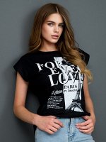 Женская футболка из набивного трикотажного полотна с фигурной планкой по горлов…