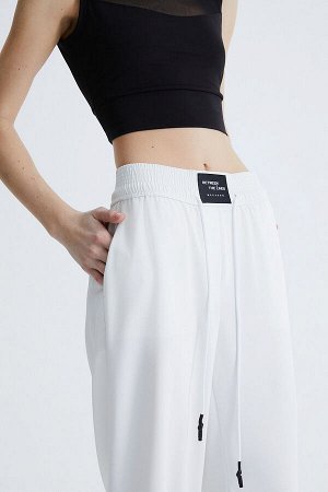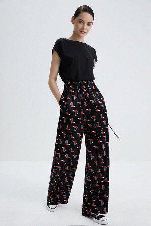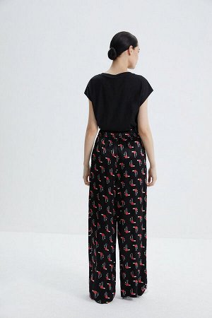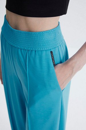 Стильные прямые брюки на широком поясе-резинке с высокими разрезами в боковых швах из легкого струя…