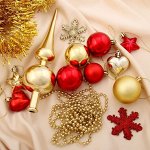 Золотистый набор из 26 элементов для новогоднего украшения включает шары, бусины и мишуру, объединё…