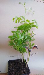 На первый взгляд - шикарный, 25 см, пышный, на второй - подломлены оба стволика, расстроило. Перевязали, привязали, будет расти)