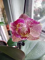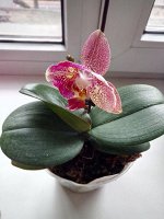 А мне достался даже с цветоносом, правда его прямо при мне на точке сломали - хряпнули передо мной горшок на прилавок вверх ногами, но я помажу его цитокининовой пастой и посмотрю что будет. Новички - читайте больше отзывов. Никакие подсохшие., вялые, "погрызеные" листья не надо отрезать. то что надо отвалится само. У меня один лист желтый - но он так может и полгода в горшке торчать, остальные три листа очень крепкие, но маленькие, короткие. Но это не росток, это явно взрослое растение, просто листья у него некрупные. У меня есть постоянно цветущая орхидея, ей пять лет, а у нее всего один, один лист! И не надо с первого дня приезда копаться как крот в мху, обрезать корни, теребить растение, щипать и колупать его. Вас из самолета вытряхни и у станка поставь что будет? дайте цветку постоять спокойно и прийти в себя. Немного дополню отзыв первым цветением. Он немножко не такой, у него две "нижних губы" и больше леопардовости. Листья короткие, толстые, немного пестроватые. Куст очень компактный, наблюдается револьверность (добирает еще бутоны на том же цветоносе)