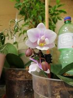 Орхидея совсем малютка, но уже с отцветшим цветоносом. Все хорошо, крепкие корни, плотные листья. На фото - орхидейка на фоне обычных орхидей