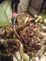 Не люблю когда размер меняют на 3,5. Как правило, и в этот раз тоже, они приходят с плохими корнями. Вот и сейчас KS Cadence 'KS Diana' имела гнилые корни, правильнее сказать здоровых корней не было см фото. Остальные орхидеи отличные, супер. Miki Pink Fox (variegata) начинает растить цветонос. Champion Royal Masque имеет два цветоноса, но они были обрезаны, оставлено по 4 почки на каждом. Работа организатора хорошая. Спасибо