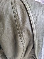 Цвет действительно нежно лимонный. Кожа не грубая, не толстая. В принципе идет в размер, может быть на пол размера велика, если судить по плечам, не