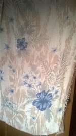 Раздача намного раньше срока. Но палантин немного не такой как я представляла, судя по фото. Он немного жатый или мятый, цвета неяркие, а немного грязноватые, тот что кажется пудро-розовым, на самом деле светло-коричневый с легким розовым оттенком. Основа не чисто-белая. На счет хлопка не знаю... на ощупь не поймешь, но не электризуется. Производство Индия. Бирка и этикетка фирменные