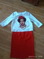 Костюм мне понравился! Качество ткани отличное, качественное. Летом жарко не будет! Что касается размерной сетки. Во первых при выборе размера организатор мне не помог, скинули таблицу размерной сетки! В принципе я не в претензиях! По размерной сетке мой размер 50, но начитавшись отзывов, решила заказать 52-й. Конечно юбка мне очень широкая, на см. 5 надо ушивать. Блуза большая в плечах, а по объему груди вроде хорошо. Еще момент, юбка темнее, чем рисунок на блузке и это очень бросается в глаза. Комплект оставила, буду перешивать под себя. Участвовать буду все равно еще, не смотря ни на что. Платья и костюмы необычные, прикольные. В моем районе такого не встретишь ни у кого! Спасибо организатору, доставка раньше срока! Комплект заказывала для случая, и о счастье, у меня будет время перешить под себя! Спасибо еще раз