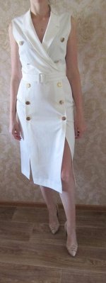Повторяться не буду о качестве вещей данной фирмы. Соглашусь с предыдущими комментариями, что материалы и исполнение на высоте! Реальное фото прилагаю. Мой рост 176 см, у туфель каблук примерно 10 см. У кого ОГ 90 см будет сидеть ИДЕАЛЬНО. Текстура ткани у платья ребристая, а на пуговицах золотистое напыление "потерто под старинку") Благодарю организатора