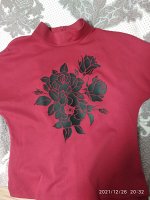 Блузон как на фото, только цвет потемнее - бордо. Он не трикотажный, а из плотной плательной ткани. Поэтому сидит не по фигуре, достаточно объемный.