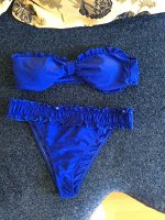 Очень длинные лямки у топа. Из за этого все висит некрасиво. Цвет бледнее, чем на картинке. Трусы в размер