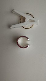 Колечко красивое, но ооочень масивное, с моим 16 размером, я утонула в нем, даже на большой палец, обьемный, я его подогнула, чтоб сделать поменьше, а верхний слой серебристой краски чуть надулся. Больше, как перстень смотриься, чем колечко. Положила для педставления размера прищепку) а так задумка не плохая, спасибо