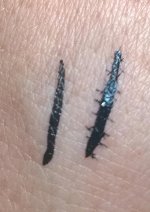 Яркая. Насыщенная. Удобно рисовать. При сухом трении не размазывается совсем. Если намочить то крупинками стирается. не размазывается. При нанесении как будто растекается по коже...четкая линия получается с трудом только на хороший слой основы на глазах... Может подсохнет и не будет так растекаться. пока не знаю...на фото показала эффект растекания по сравнению с другой подводкой