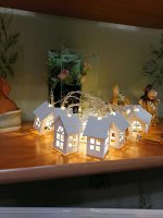 Гирлянда классная, создает уют. Приклеила ее на окно и сижу, радуюсь как ребенок! И дизайн такой, что можно не только под новый год ее использовать.ЕщёГирлянда классная, создает уют. Приклеила ее на окно и сижу, радуюсь как ребенок! И дизайн такой, что можно не только под новый год ее использовать.. Домики (20 шт.) высотой 6,5 см., сделаны из дерева, покрыты белой краской, склеены достаточно надежно, не хлюпенькие. Длина провода от последнего домика до вилки 46 см. На гирлянде USB-штекер, тут пригодилась вилка от зарядки телефона, которая давно валялась без дела. Покупкой очень я довольна↑