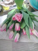 Тюльпаны отличные! Наисвежайшие! Пишу отзыв через 5 дней, как забрала цветы, а они выглядят, как-будто вчера их только срезали! Тюльпаны были небольшие, просто молоденькие. А потом, и бутон увеличился в 2 раза, и стебель удлинился. Луковички отрезала и отдала родственнице в частный дом