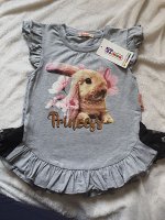 Футболка очень классная . Рисунок- наклейка. Но размер ..... первый раз заказала с этой серии корраловую с котиком и серую с зайкой. 110 и 116 см р