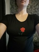Футболка совсем не соответствует картинке, т.е. она черная, в центре наклейка (именно наклейка) цветка и все. На картинке футболка свободная, достаточно длинный, широкий рукав, по факту ткань тянется и полностью облегает силует и короткий рукав. Удивило, что такое несоответствие заказа картинке у уважаемого мною организатора, у которого заказываю не первый раз и доверяла ему