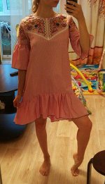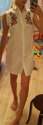 Платье-рубашка в вышивкой чуть велико в районе подмышек, а так село хорошо, длина хорошая,на рост 164 не короткое. Цветы не аппликация,а действительно вышиты. Второе платье понравилось меньше, хотя очень интересное. Проблема с рукавами. Уж очень узкие в районе манжеты. Ткань не тянется. С подкладом тоже беда...Почему-то у подклада размер S, хотя платье размера М....У белой вышитой ткани разрез посередине, одна половинка чуть ниже другой, а под ним ткань оставляет желать лучшего... А в общем закупка не плохая...заказывать еще буду