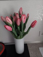 Чудесные цаеты. Огромное спасибо!! Одно фото сразу ,как забрала. Второе на след день. Тюльпаны были с луковицами. Все хорошо упаковано. Курьер прия
