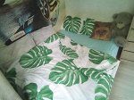 Простыня голубая в клетку, пододеяльник с двух сторон из одной ткани, белый с листьями. Комплект замечательный. Заказ пришел на 10 дней раньше