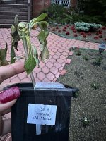 Слабый росток, бледный, половина листьев завяли и опали, пересохлая почва и корни. Не знаю выживет или нет, посадила сразу как забрали