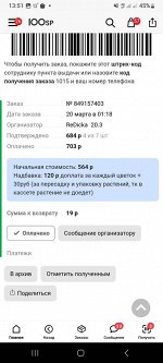 Когда делалала заказ,цена на цветы была ниже,когда подтвердили заказ -цена вдруг выросла ,потом попросили ещё за упаковку 120 р . Отказалась .Оплатила за 3 гвоздики и за 2 георгины .За несколько дней до получения товара -увидела ,что одну гвоздику не подтвердили ,хотя я за неё заплатила .За доставку содрали 180р. За гвоздику деньги не вернули .Доставку обещали 3 мая,пришло 26 мая .Не советую этого организатора .Цветы пришли живые .Сумма к возврату 19 рублей 🤦♀️