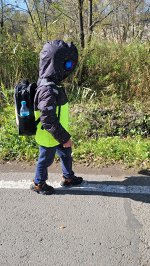 С застегнутым капюшоном на динозаврика похож. Когда со школы идем, все мимо едущие водители, разглядывают↑