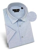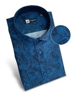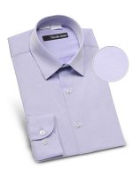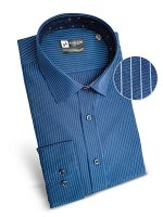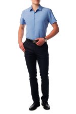 Рубашка классическая с длинным рукавом, однотонная ткань синего цвета с легким эффектом меланж. Силуэт полуприталенный, можно носить как на выправку, так и под заправку. Стиль деловой, можно носить как с галстуком, так и без него, чтобы выглядеть менее официально. Носить можно с темно-синими джинсами, так и с брюками в контраст к тону основной ткани.