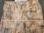 Брюки с высокой посадкой и прямыми штанинами. Боковые карманы, декоративные прорезные карманы сзади. Застежка-молния, пуговица и металлический крючок.