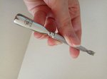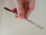 Пушер для кутикулы 408 - большая и маленькая лопатка 9 и 6 мм ширины. У большой лопатки плавный загиб, у маленькой резкий. Длина пушера 136 мм. Двойная полировка поверхности, рифлёная ручка диаметром 6.7 мм