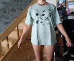 Это нечто. С фото общего может только рисунок. Бледнее намного. Длина чуть ниже поясницы. На фото футболка длиннее на 30 см. Но за это она очень широкая. Нелепая распашонка См фото. Я 46-48 размера
