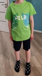 Описание: Комплект для мальчиков: футболка и шорты. Новая конструкция: увеличенный объем и длина футболки, легкая небрежность. Горловина из рибаны. Эластичный принт - имитация светящихся неоновых линий. Надпись «ДИКИЙ». Шорты с внутренней регулировкой по поясу. Состав: верх: 100%хлопок, низ: 100%хлопок