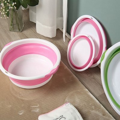 Мне помогают складные тазы, вёдра и другие практичные вещи — они экономят место и всегда под рукой. Складываю их и храню под ванной — удобно и ничего не загромождает пространство: