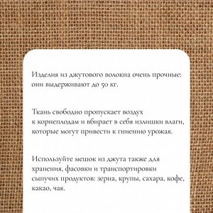 Лёгкий и вместительный мешок из джута пригодится для хранения урожая. Материал производится из кустарников семейства липовых. Он полностью натуральны…