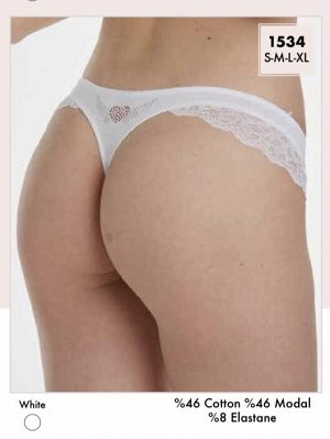 Нежные кружевные женские трусики стринги, украшенные декоративным элементом сзади